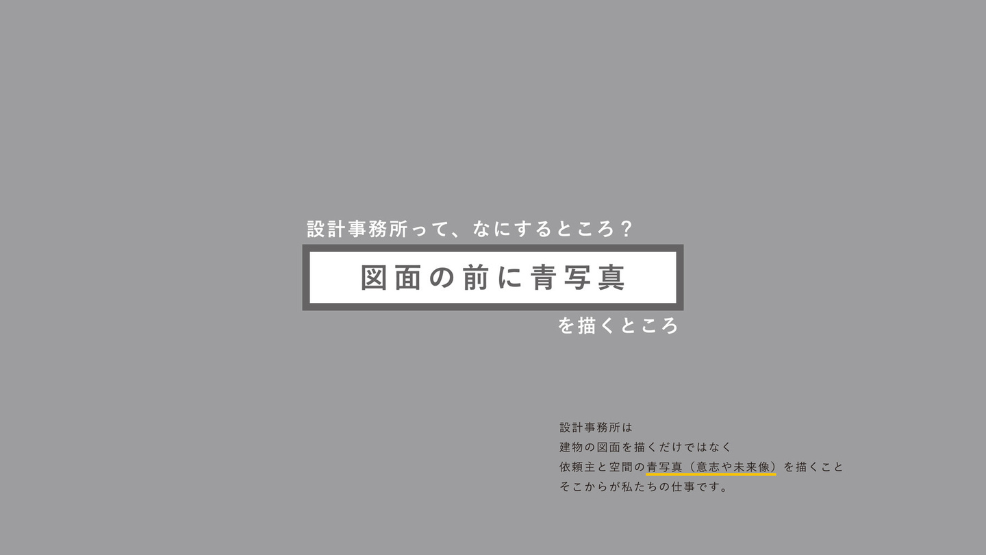 建築は奇抜でなくてもそれだけで豊かで深遠なものです。だからといって無難なだけもいけません。 設計事務所は建物の図面を描くだけではなく、ご依頼主と空間の青写真(意志や未来像)を描くことからはじめます。 建築の場合、基本計画、基本設計、実施設計、設計監理という一般的な流れで進めます。 建築以外のプロジェクトの場合、一概に設計監理業務の手順が当てはまりませんが、 一貫していることは、「聞いて、訳して、最適解を設計図に置き換える。」それが私たちの建築手法です。