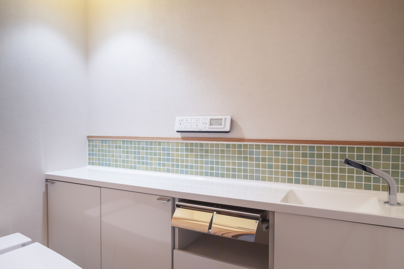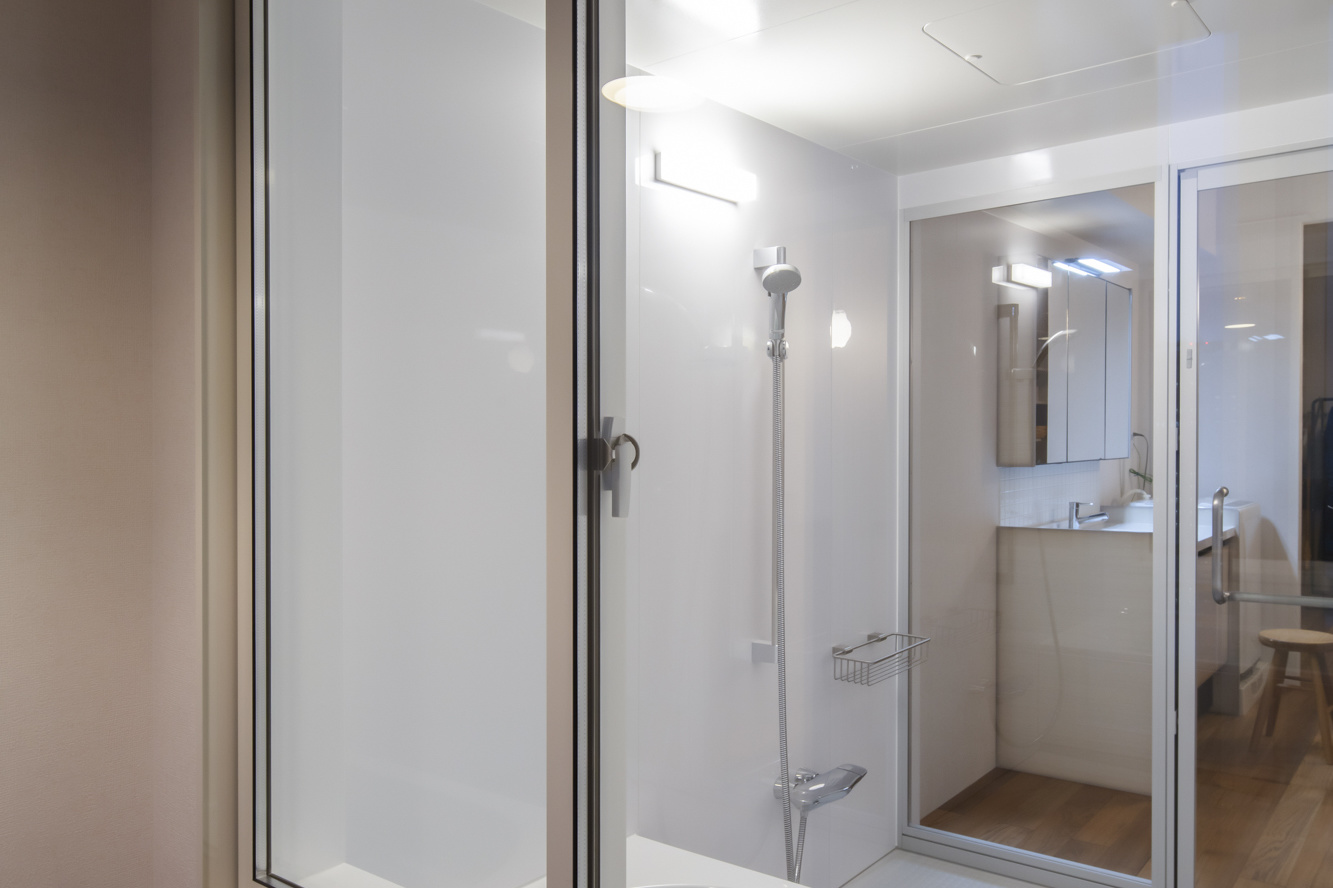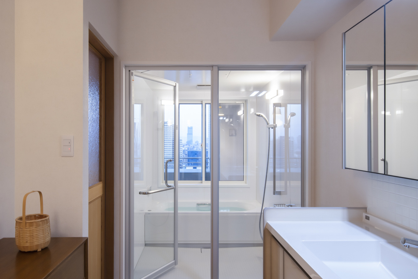 タワーマンションの高層階。一般的なマンションのリフォームとの違いはさまざま。物資の搬入出の手間、インターフォン・セキュリティ・警報装置などの配線への配慮はタワーマンションの特有の配慮すべきポイント。普段のリフォームとは少々コスト感覚が異なると考えておいてよいでしょう。さらに、管理事務所との密な連携が必要です。床下配管スペースの活用が今回はできたので大胆な水廻りのレイアウト変更が実現。