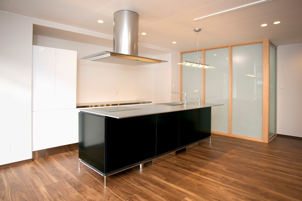 キッチンを中心に据え置き、インテリアに配慮したキッチンと周辺家具や照明器具をコーディネート。