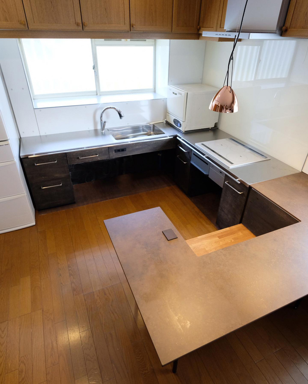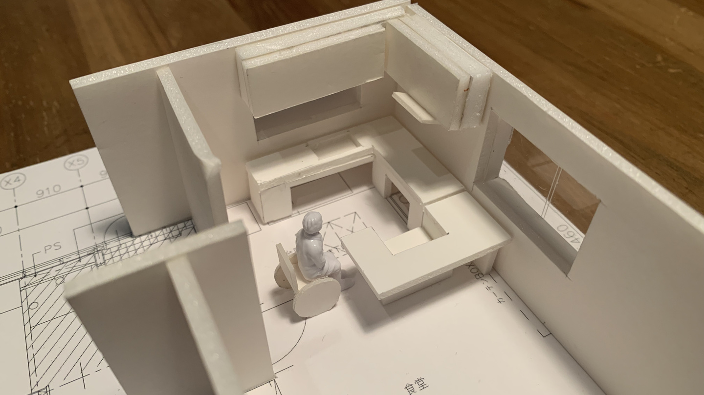 バリアフリーの商品は人間工学に基づき、至れり尽くせりではあるものの、先回りしすぎたものが多く、バリアのあるデザインが多い印象。 そのバリアはなんだろうかとヒアリングと観察を積み重ねて設計しました。 そのひとつのキッチン。 座っていると、切るにも鍋を見るにも一般的な高さだと 高すぎて中も見れないし、何より危険です。 また観察していると、配膳するのにも近くがいいかということで ダイニングテーブルを併設することにしました。 食べる高さと同じくした調理スペースとすることで、 DKの一体化や広がり、使い勝手も安全面も飛躍的に向上しました。 また既存の家具や仕上げ材への愛着があり、 それとの共存など、あるものと調和させることも、 バリアフリーのリノベーションには大事な要素と考えています。 今まで見ていた風景が一変してしまうと、 特に長らく住んでいた空間であればあるほど混乱を招きかねないのです。